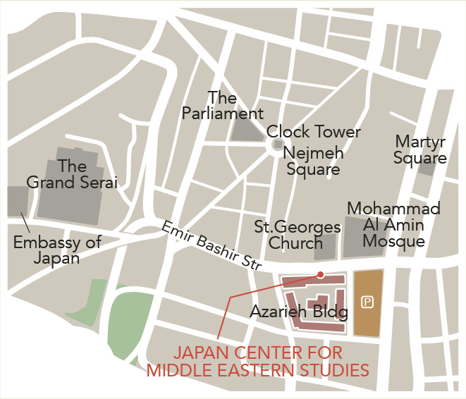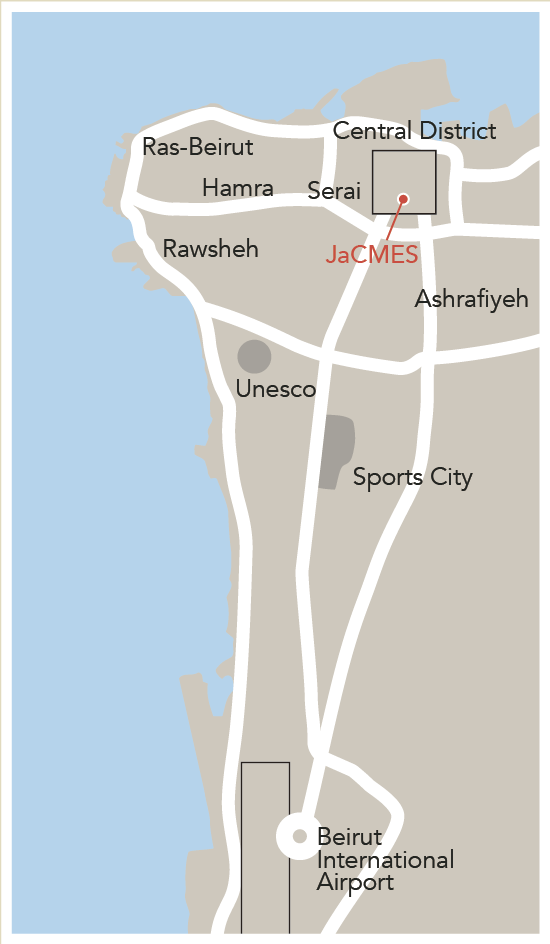レバノンの人々に「ダウンタウン」という呼び名で知られるベイルートの中心部のビジネス街にあります。レバノンの国会議事堂や首相府、日本大使館から徒歩5分ほどの場所です。この地区のランドマーク的な「アザリーエ・ビル」の2階にJaCMESがあります。同ビルにはベルギー大使館やカーネギー中東研究所なども入居しています。レバノン独立の象徴的空間である「殉教者広場」には徒歩1分、道をはさんで向かいにキリスト教マロン派のサン・ジョルジュ・カテドラル、その右側並びにスンニー派イスラームのアル・アミーン・モスクがあります。また左側並びにはローマ時代の石造列柱の遺跡があります。レバノンの古代からの重層する歴史と宗教的多様性を一望できる場所です。